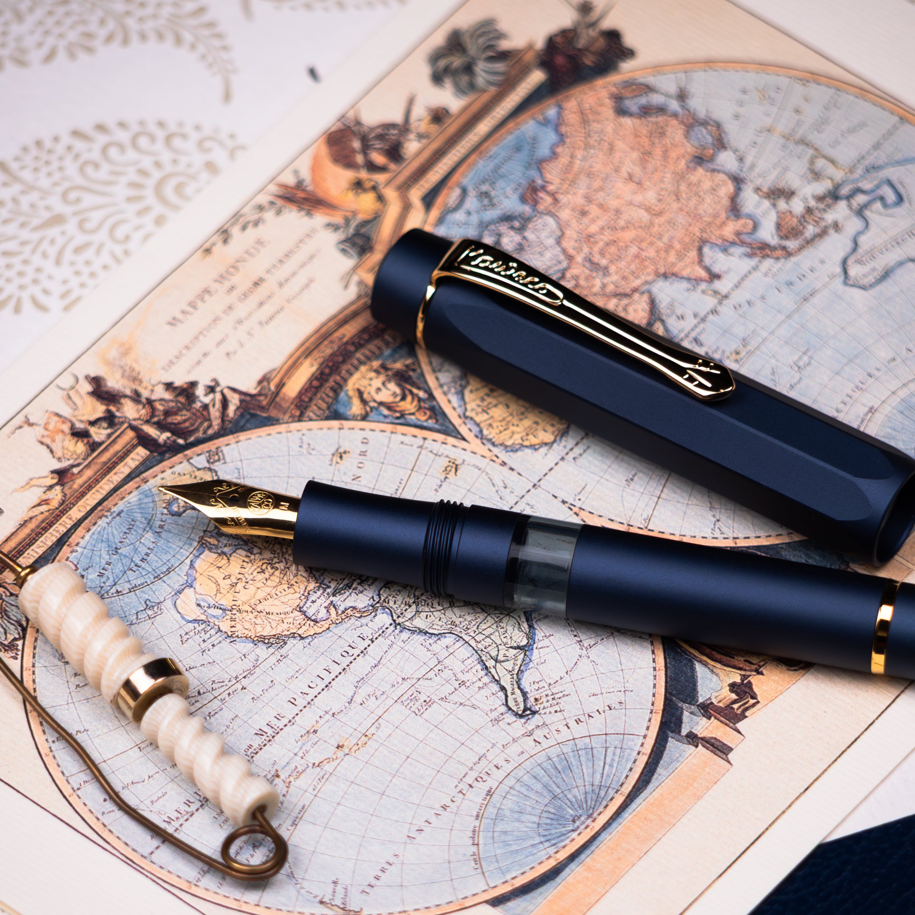 Premium aluminium construction meets smooth piston-filing performance in an elegant navy and gold.